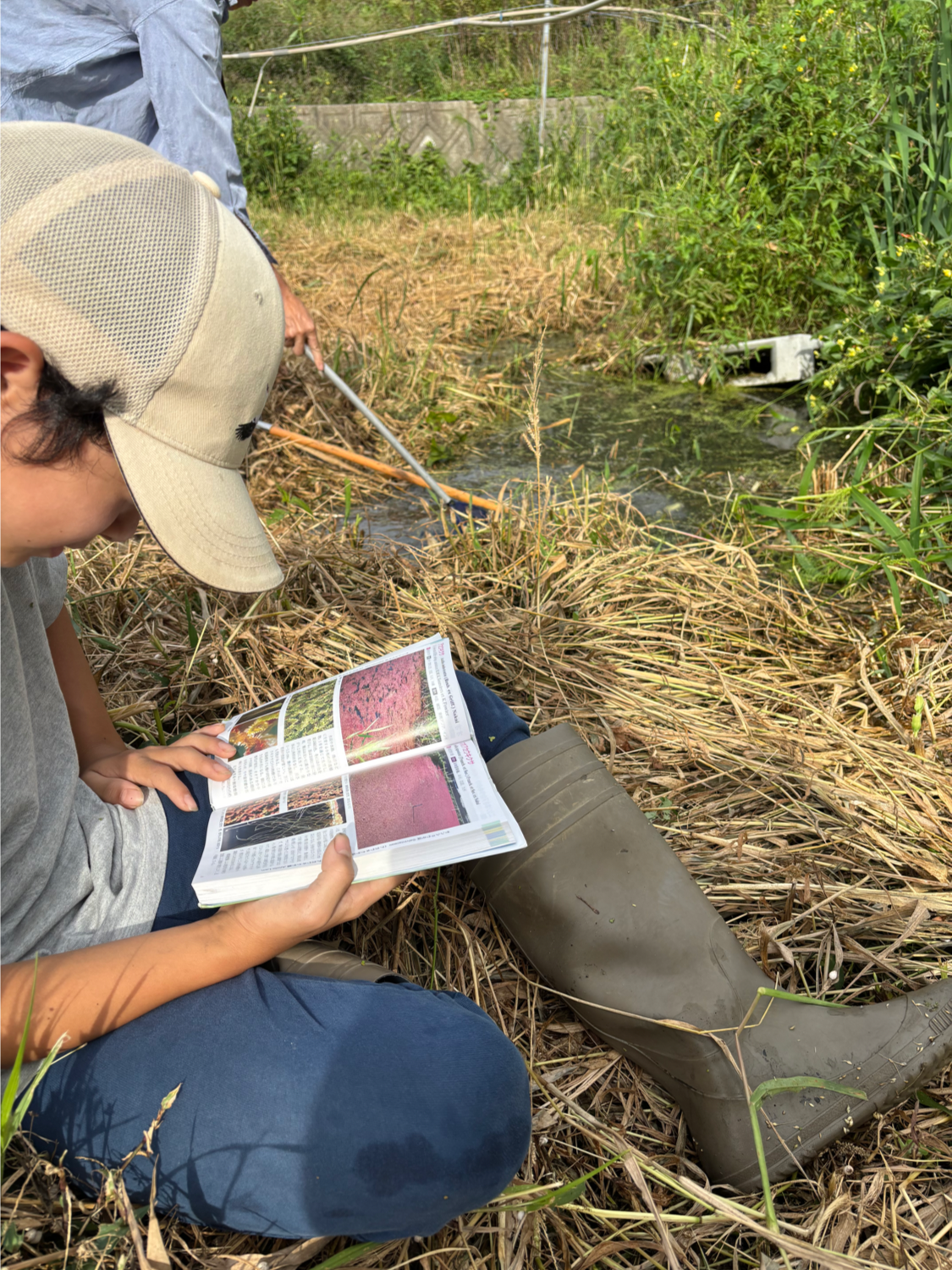ラボの生徒さんと一緒に、畑の中にあるビオトープ観察。