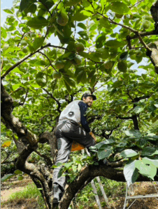 Where do I see all this falling happening around me? In the heavier footsteps we all take as we carry our baskets back to the truck for sorting, in the smooth arc we make when we take the ripe fruits off the stem and carefully place them in the basket. I feel the downwards pull as I climb up and down on my ladder. I even see it in the farm truck:
